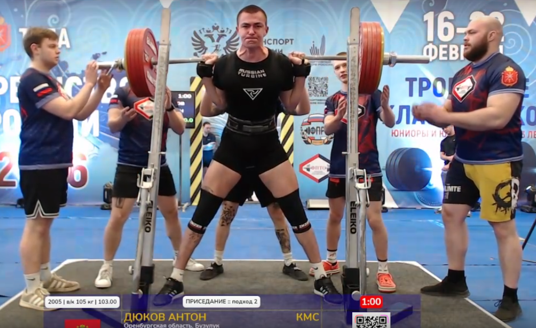 Мастера спорта России. (Присед: 200; жим: 110; тяга: 235; сумма: 545кг).