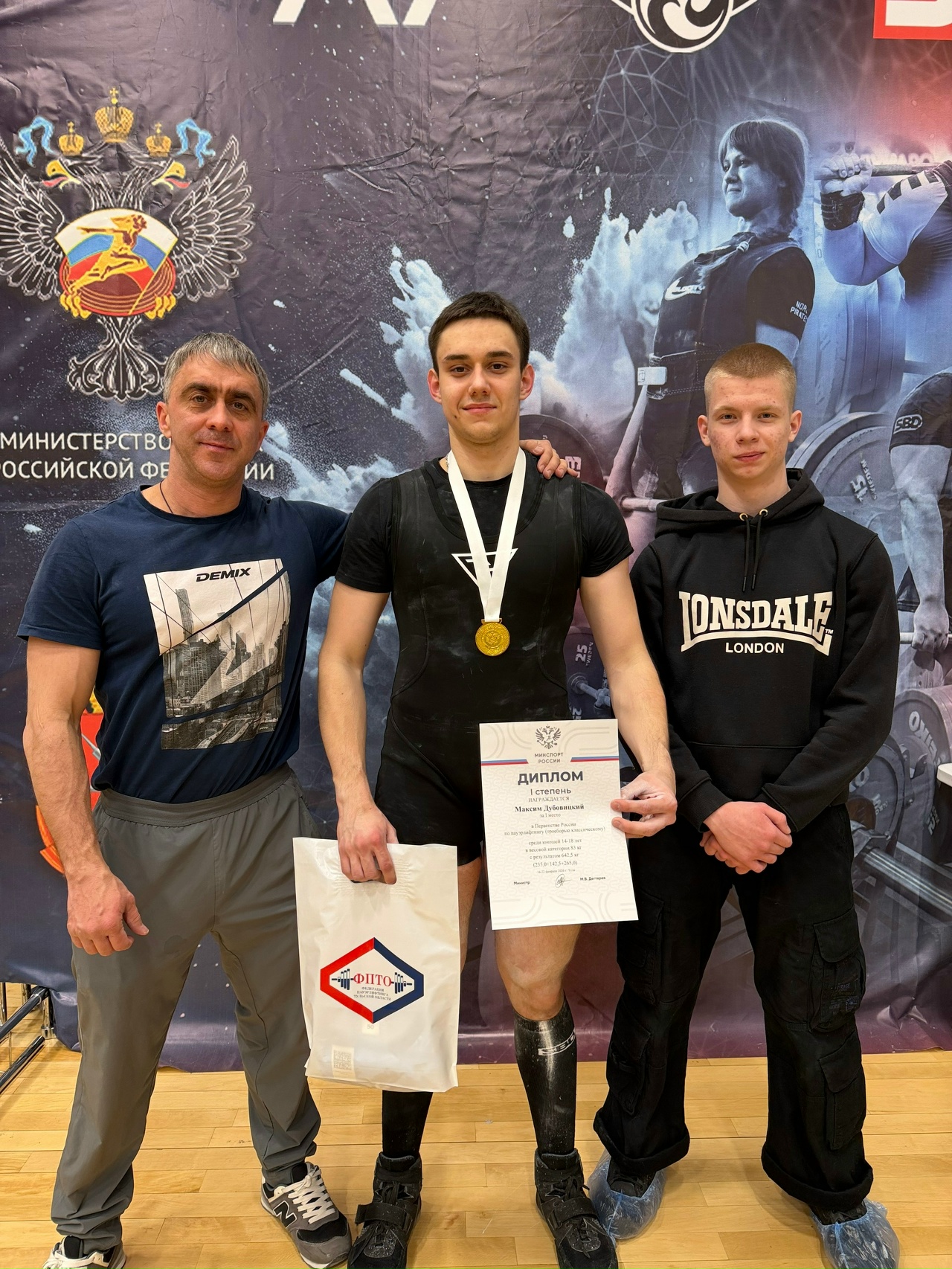 3 место в абсолютном зачёте! (Присед: 235; жим: 142,5; тяга: 265; сумма: 642,5кг).